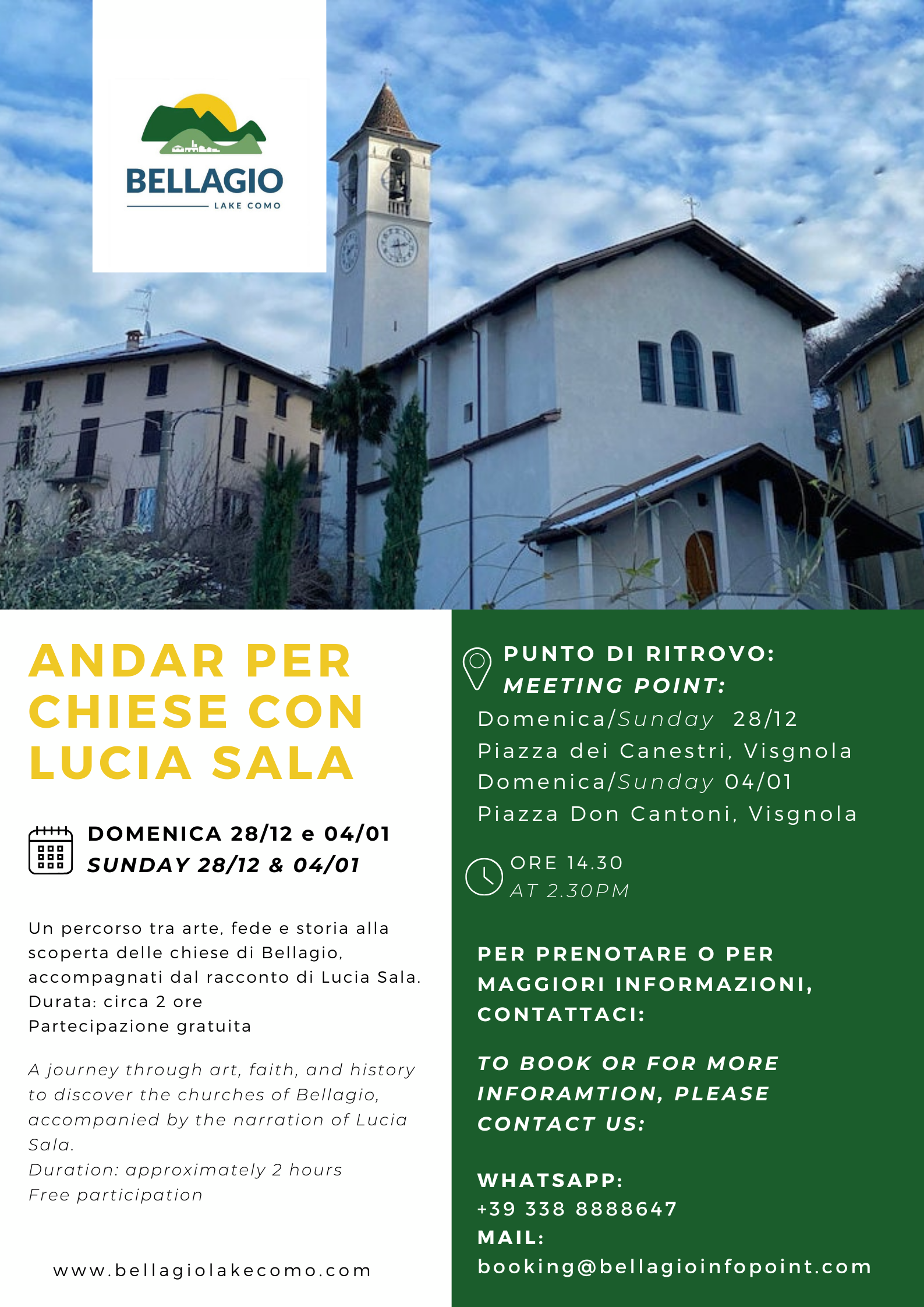 Piazza Don Cantoni, Visgnola. Ore 14.30. Un percorso tra arte, fede e storia alla scoperta delle chiese di Bellagio, accompagnati dal racconto di Lucia Sala. Chiese di Casate e Suira. Durata: circa 2 ore. Partecipazione gratuita. Per maggiori informazioni WhatsApp al +39 338 8888647 o mail a booking@bellagioinfopoint.com . Evento organizzato da BellagioLakeComo.