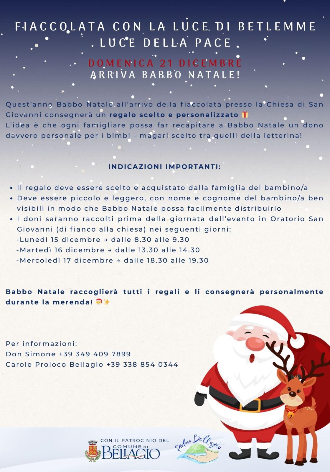 Piazza San Giovanni. Dopo l’arrivo della fiaccolata. Calda merenda offerta e arrivo di Babbo Natale con una sorpresa speciale per ogni bambino. Per informazioni Don Simone: +39 3494097899 & Carole Proloco Bellagio: +39 3388540344. Evento organizzato da Parrocchia Bellagio & Proloco Bellagio.
