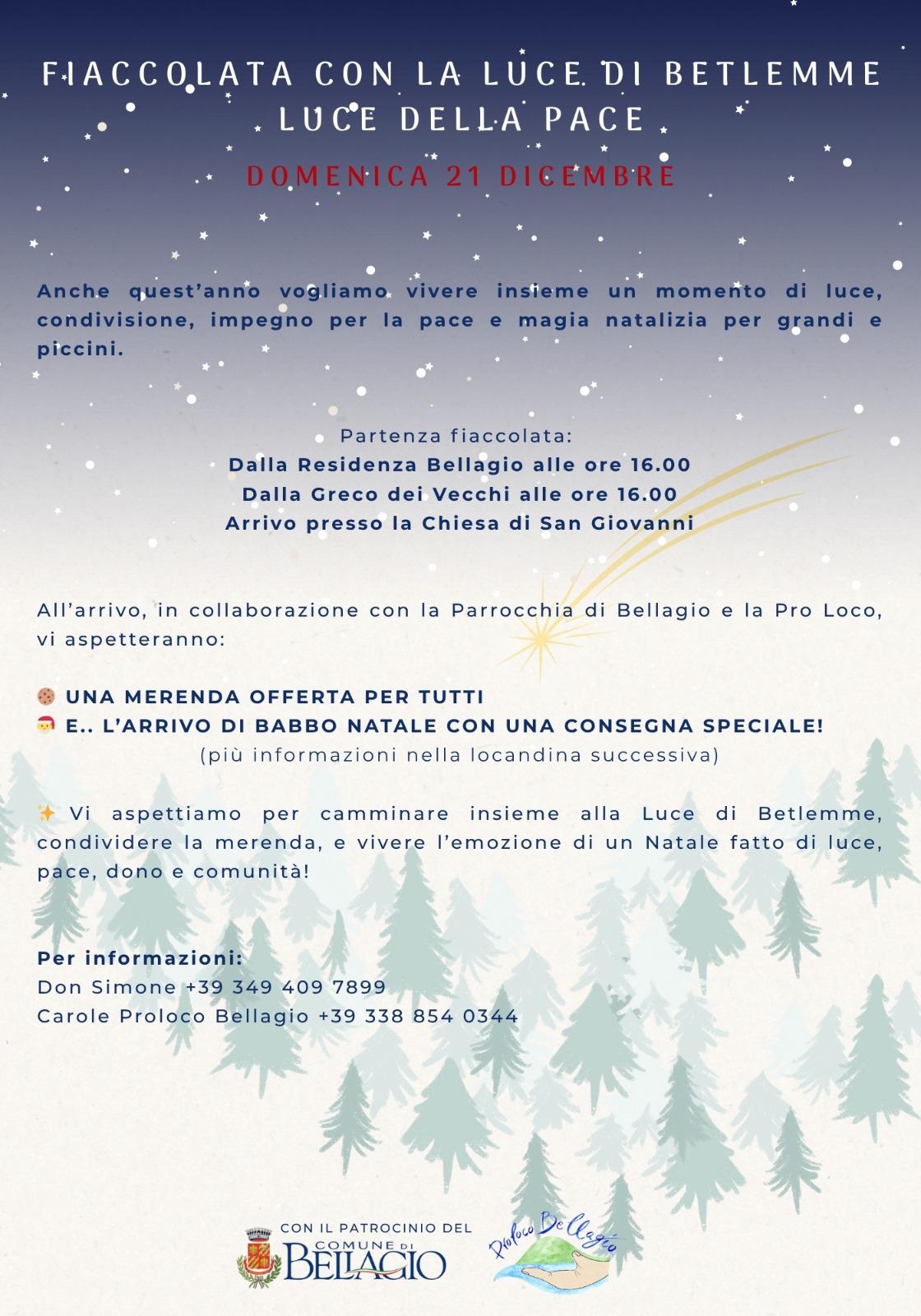 Partenza da Residenza Bellagio e da Fondazione Greco De Vecchi. Ore 16.00. Fiaccolata della luce di Betlemme partendo dalle due case di riposo e arrivo presso la piazza di San Giovanni. Anche quest’anno vogliamo vivere insieme un momento di luce, condivisione, impegno per la pace e magia natalizia per grandi e piccini. All’arrivo ci sarà una merenda offerta per tutti. Per informazioni Don Simone: +39 3494097899 & Carole Proloco Bellagio: +39 3388540344. Evento organizzato da Parrocchia Bellagio & Proloco Bellagio.